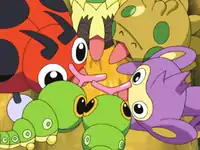 Just in time, Cheryl and our heroes arrive to rescue Burmy. Burmy manages to help rescue itself by teaming up with Chansey to defeat Meowth and Wobbuffet, and it finally evolves into Mothim! The stage is set for everyone to join forces and send Team Rocket blasting off. That's not all—Mothim then picks up a scent and leads Ash and the gang towards a new chapter in the search for the Amber Castle!