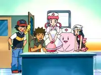 Now Team Rocket has another problem to deal with, because Brock and the gang have finally caught up with them. Nurse Joy is feeling confident enough to help our heroes battle, too! But it comes as a surprise to everyone when pint-sized Happiny turns out to be so strong, it can clobber Team Rocket on its own. Pikachu helps finish the battle, and then our heroes are ready to get back on the road to Hearthome City... and Nurse Joy is ready to get back to work!