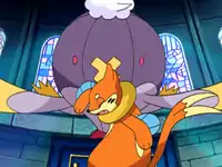 Ash is on the defensive now, but he and Chimchar have one last trick left. By using Dig to get behind Drifblim, Chimchar gains the advantage of surprise. It launches itself at Drifblim from behind, and the surprise attack means it's lights out for Drifblim. Ash has won the Relic Badge—and over in Majolica Town, Jessie and her Yanmega have won a Contest Ribbon, too! That night, Barry announces his plan to take a boat from Canalave City to Iron Island, where he intends to train. Barry dares Ash to take on the Canalave Gym, and Ash confidently accepts. Now both Trainers are headed to Canalave, but it remains to be seen whether they can travel together!
