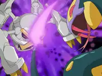 Back on the mountain, James calls out to Metagross, then sends out Mime Jr. as Metagross uses Psychic on some boulders. James commands Mime Jr. to use Teeter Dance and confuse Metagross. However, this backfires badly as the boulders Metagross used Psychic on fly out of control. James scoops up Mime Jr. and runs away, stopping just short of a cliff. Metagross corners James and Mime Jr., forcing James to call out Carnivine. After dealing with Carnivine's usual antics, he commands Carnivine to use Vine Whip. Metagross counters with Psychic, and James, Mime Jr., and Carnivine are ensnared in Carnivine's vines. Metagross then begins using Psychic to drop them over the cliff when Yanmega comes to the rescue with Steel Wing, which releases James and his Pokémon. Seviper then follows up with Poison Tail, and Metagross is knocked off the cliff.