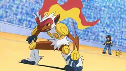 - When Ash is thinking about how to deal with Drapion's Toxic Spikes, Infernape's tail is missing.