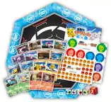 A special set called Melee! Pokémon Scramble × Pokémon Card Game (Japanese: 乱戦!ポケモンスクランブル×ポケモンカードゲーム) was released on July 10, 2009 and combines the play styles of Pokémon Rumble and the Pokémon Trading Card Game by featuring a play area for up to seven players. The set includes sixteen cards that depict Pokémon as they appear in Pokémon Rumble and an array of accompanying items: a battle mat, a die plate, player markers, damage counters, four Energy die, a Target dice, and a rulebook.