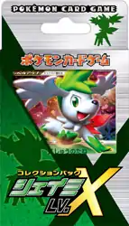 The Shaymin LV.X Collection Pack (Japanese: コレクションパック シェイミLV.X) was the third of the three Collection Packs available to purchase from April 18, 2009. As with the others, it includes twelve reprinted promotional cards originally from the DP-P and PPP Promotional card collections, with particular focus on the alternate art print of Shaymin LV.X.