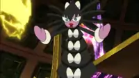 Later, Damon dons new clothing and begins to awaken the castle using his Sigilyph, activating the Protecting Pillars surrounding it. With Sigilyph's power, he contracts the barrier of the Protecting Pillars to force Victini into the castle, then traps it in a device that funnels its power into the Sword of the Vale itself. The castle begins to ascend, all according to Damon's plans, but he is soon confronted by Ash, Iris, Cilan, Juanita and Carlita, who all see the torture he is inflicting on Victini. Even Juanita is horrified - stunning Damon - and sends out her Golurk to make a desperate bid to stop Reshiram or Zekrom, but fails. Everyone else, meanwhile, is held in check by Damon's Reuniclus or Gothitelle.