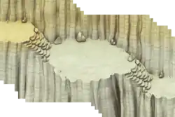 It is located east of Tilt Village on Mitonga Island and can be accessed via a cave in Tilt Village. During their first visit there, players must go through the cliffs under a certain time limit. They must make many precise jumps while riding Raikou to get through the area. In addition, the Pokémon Pinchers' Submarine can be found here during the player's first visit.