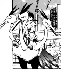 Blaming Team Rocket for his loss, Dario tied them up and had his Dodrio use Peck on them.