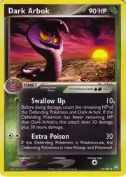 Dark Arbok (Japanese: わるいアーボック Bad Arbok) is a dual-type Grass/Darkness Stage 1 Pokémon card. It is part of the EX Team Rocket Returns expansion.