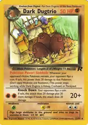 Dark Dugtrio (Japanese: わるいダグトリオ Bad Dugtrio) is a Fighting-type Stage 1 Pokémon card. It is part of the Team Rocket expansion.