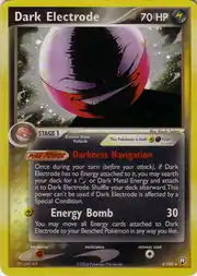 Dark Electrode (Japanese: わるいマルマイン Bad Marumine) is a dual-type Lightning/Darkness Stage 1 Pokémon card. It is part of the EX Team Rocket Returns expansion.