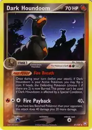 Dark Houndoom (Japanese: わるいヘルガー Bad Hellgar) is a dual-type Fire/Darkness Stage 1 Pokémon card. It is part of the EX Team Rocket Returns expansion.