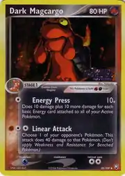 Dark Magcargo (Japanese: わるいマグカルゴ Bad Magcargot) is a dual-type Fire/Darkness Stage 1 Pokémon card. It is part of the EX Team Rocket Returns expansion.