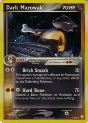 Dark Marowak (Japanese: わるいガラガラ Bad Garagara) is a dual-type Fighting/Darkness Stage 1 Pokémon card. It is part of the EX Team Rocket Returns expansion.