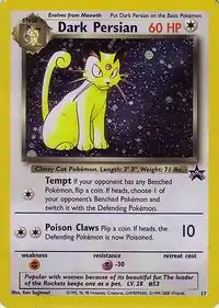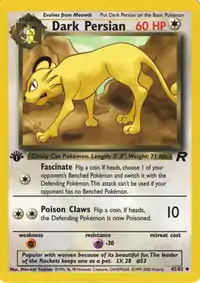 Dark Persian (Japanese: わるいペルシアン Bad Persian) is a Colorless-type Stage 1 Pokémon card. It was first released as part of the Team Rocket expansion.