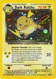 Dark Raichu (Japanese: わるいライチュウ Bad Raichu) is a Lightning-type Stage 1 Pokémon card. It was first released as part of the Team Rocket expansion.