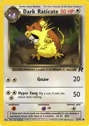 Dark Raticate (Japanese: わるいラッタ Bad Ratta) is a Colorless-type Stage 1 Pokémon card. It is part of the Team Rocket expansion.
