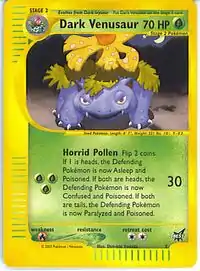 Dark Venusaur (Japanese: わるいフシギバナ Bad Fushigibana) is a Grass-type Stage 2 Pokémon card. It was first released as one of the Unnumbered Promotional cards in Japan, and later released in English as a Best of Game promotional card.