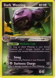 Dark Weezing (Japanese: わるいマタドガス Bad Matadogas) is a dual-type Grass/Darkness Stage 1 Pokémon card. It is part of the EX Team Rocket Returns expansion.