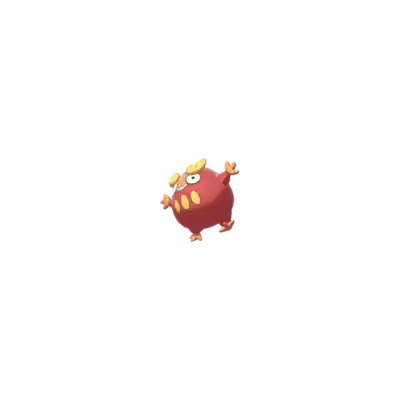 Darumaka is a round, red Pokémon with short arms and legs and a stubby tail. It has an orange face and curly yellow eyebrows. It has three yellow ovals on its abdomen and a curvy yellow line on its back. Its hands and feet are orange with three digits each.