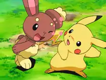 In Piplup, Pansage, and a Meeting of the Times!, Buneary was shy after being introduced to Ash, Iris, and Cilan's Pokémon. However, upon seeing Pikachu, it quickly embraced him, much to Oshawott's disappointment.