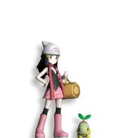 Dawn's design is based on her appearance in Pokémon Diamond and Pearl. Turtwig is one of the starter Pokémon of Sinnoh in the core series games. Turtwig and Torterra's Dex entries come from Pokémon HeartGold and SoulSilver, and Grotle's from Pokémon Diamond.