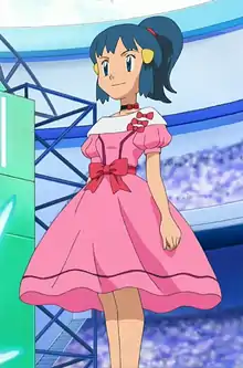 - On the Pokémon Learning League website, her clothing has been altered so that her white undershirt has sleeves and she is wearing black stockings or tights.
