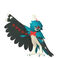Compared to Alolan Decidueye, Hisuian Decidueye has a smaller wing area and thicker legs. The plumes around its ankles are longer, and its feet are black with white talons. Its tail feathers are red. Its head and neck covering is also red, with orange and white accents, and together they resemble an ayaigasa.[2] Its wings appear to have more layers, and the rachises of its feathers are capable of storing air, allowing it to withstand the extreme cold of the Hisui region. Hisuian Decidueye is the only known Pokémon capable of learning the move Triple Arrows.