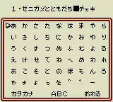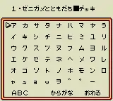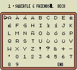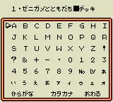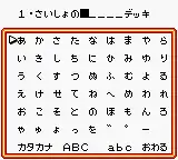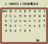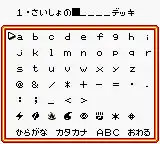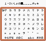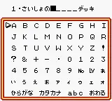 The deck name may have up to 20 characters in the American and European versions of the first game or 10 characters in the Japanese version of both games. The word "Deck" is mandatory at the end (or at the beginning in some languages), which is automatically added and doesn't count towards the character limit. In the Japanese version of Pokémon Trading Card Game, there are 3 separate screens: hiragana, katakana, and capital letters. In Pokémon Card GB2: Here Comes Team GR! (which is Japan-only), there are 4 separate screens: the same as before plus another for lowercase letters. The Select button is a shortcut to switch screens, which does not do anything in languages other than Japanese. The player types the deck name by pointing the cursor to a character and pressing A, and erases the last character by pressing B. There is an End (Japanese: おわる Finish) button at the end of the deck name screen, to finish typing the deck name. The Start button is a shortcut to point the cursor to the End button.