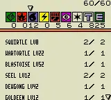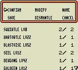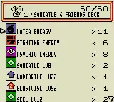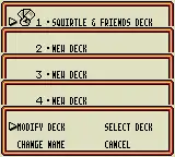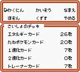 The player may press B in the list of cards to see these options. In Pokémon Card GB2: Here Comes Team GR!, this menu is displayed together with a list of how many Energy cards, Basic Pokémon cards, Stage 1 Pokémon cards, Stage 2 Pokémon cards, and Trainer cards are in the deck, including any unsaved changes.