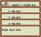 In both games, the Deck option in the menu displays the list of decks, which contains four deck slots. If the player has more than one built deck, they may choose one of them as their main deck, which is identified by a symbol of a hand holding cards. The main deck is used in all duels. Empty decks have the placeholder text "New Deck" (Japanese: あたらしく つくる build new). The only information available on this screen are the names of the decks, the deck slots used, and which is the main deck.
