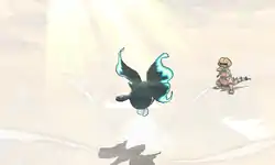 | Honchkrow's wings become outlined in a light-blue glow. The outline disappears as it releases multiple light-blue crescents by flapping its wings. Its wings then become outlined again as the crescents go for the opponent. | |||
