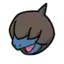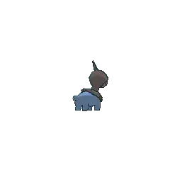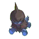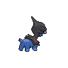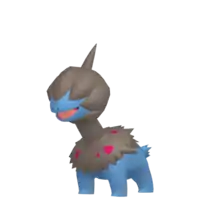 Deino is a small blue quadrupedal Pokémon with black fur covering its head and neck, concealing everything but its mouth from view. The fur around its neck also has six purple spots encircling it, which resemble bruises. The hair on the top of its head takes the shape of a single small horn. It also has a short tail that appears to be bitten off. As it is blind, it will bite at and eat anything that moves, and it has the vigor and energy to bite constantly and without stopping. It never stops biting, making it dangerous to approach without taking precautions. It will also ram anything, ensuring that it always has bruises all over it. As seen in the anime, it may rear up on its hind legs when happy. Deino primarily lives in caves with abundant water sources.