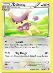 Replace is an attack that first appeared on Mew-EX from Dragons Exalted. Play Rough is a move in the Pokémon games that Delcatty can learn as Skitty. This card's Pokédex entry comes from Pokémon Y.