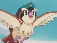 | Ken (Japanese: ケン Ken) is one of the many carrier Pidgey that Malachi and his grandfather own. They are used in the Pidgey Express business to send packages and newspapers around the Whirl Islands. Ken is distinct from the Express's other Pidgey because of the tiny hat it wears. It was first seen when a wild Fearow was pecking it and injuring it. Ash's Noctowl stepped in and scared off the Fearow. Ken plummeted to the ground, but eventually became friends with Noctowl. Brock bandaged the tiny Pidgey's wings and along with Ash and Misty found Malachi. He took them to Malachi's grandfather's house where Ken was then fully healed. | ||