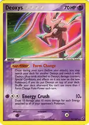 Deoxys (Japanese: デオキシス Deoxys) is a Psychic-type Basic Pokémon card. It is part of the EX Deoxys expansion.