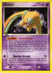 Deoxys (Japanese: デオキシス Deoxys) is a Psychic-type Basic Pokémon card. It is part of the EX Deoxys expansion.