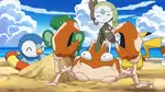 As the group was searching for each other, Oshawott and Piplup drove away the Onix that Ash and Cilan encountered. Meloetta also took part in the battle. Since Piplup was separated from Dawn, Dawn and Iris had to run away when one of them was chasing the two. As the Onix lost sight of them, the two continued their way back to the beach. Along the way, Iris saw a Magnemite and Dawn saw a Foongus. It didn't go well for either of them as both of them were attacked by the two Pokémon.