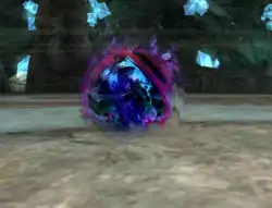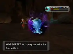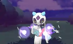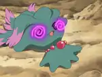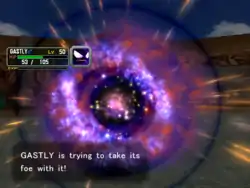 | Misdreavus's eyes glow purple. After fainting, two swirling purple lights come out of them and hit the opponent that knocked Misdreavus out. The opponent then becomes surrounded by a purple aura and instantly faints. | |||