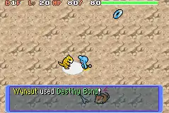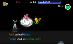 In Red Rescue Team, Blue Rescue Team, Explorers of Time, Explorers of Darkness and Explorers of Sky, Destiny Bond is a move with 12PP and 100% accuracy. The user target enemy in front, cutting corners. The user gives itself Destiny Bond status condition, linked to the target, for 11 turns. Any damage sustained by the user will be also inflicted on the target, as long as the user does not faint. If the move is bounced back, the user will be linked to themselves. In such case, Destiny Bond will trigger if the user hurts themselves from recoil/crash damage, or a different move that was bounced back at the user. This move is affected by Taunt.