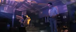 Having received a key from Yoshida, Tim goes to the apartment building where Harry lived. He again encounters the Psyduck and soon meets its partner Lucy Stevens, who is investigating the circumstances around Harry's death despite her position as a fluff column blogger for news network CNM. Lucy tries to gain information from Tim, but he turns her down and goes to Harry's apartment. He comes across a room made to resemble his childhood bedroom, as well as an unsent letter from Harry asking him to move to Ryme City so they may reconcile. Later, while searching Harry's desk, Tim finds a vial of purple gas labeled "R", which he accidentally opens. He vents the gas out of a window, unaware that a group of Aipom are nearby and are exposed to the fumes. Tim hears strange noises and encounters a Pikachu wearing a deerstalker hat that, to his shock, speaks human language. He barely has time to make sense of Pikachu's speech before the Aipom invade the apartment, driven mad by their exposure to the gas. Tim and Pikachu end up being pursued to the roof of the building, where they escape to the street using a trash chute. Once the Aipom calm down and leave, they go to a nearby street market where Tim tries to get other people to hear Pikachu talking, but none of them can hear Pikachu say anything other than his name.