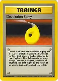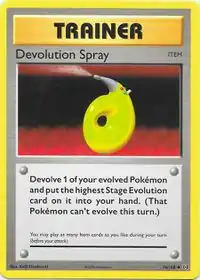 Devolution Spray (Japanese: 退化スプレー Degeneration Spray) is an Item card. It was first released in the Base Set as a Trainer card.