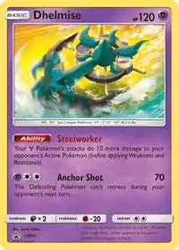 Steelworker is an Ability in the Pokémon games that Dhelmise can have. Anchor Shot is a move in the Pokémon games that Dhelmise can learn. This card's Pokédex entry comes from Pokémon Sun.
