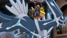 In Giratina and the Sky Warrior, black, poisonous clouds had overlaid the once beautiful and law-breaking Reverse World. The cause of this was Dialga's and Palkia's prior battle, which angered Giratina. To get revenge, in a lake, it dragged Dialga into its own world. There, Giratina and Dialga did battle. Every moment, Dialga tried to escape; however, Giratina continued to pull it back into the Reverse World. Finally, thanks to Shaymin, Dialga was able to run away, but not before enveloping Giratina in a time loop to trap the Renegade Pokémon in the Reverse World in order to fully escape. Dialga made a small appearance at the end of the movie, in which Giratina went to attack it again.