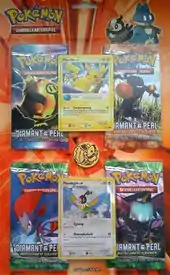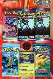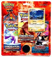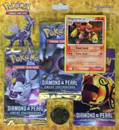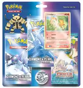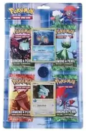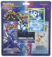 Released in late May 2007 shortly after the release of the Diamond & Pearl expansion were a number of Blister Packs. The Three Pack Blisters came in three varieties: each one containing either one of the three Generation IV starters as promotional cards. These Blisters also included two Diamond & Pearl booster packs, one late EX Series booster pack, and a coin featuring Palkia. There were two types of Two Pack Blisters made available. The first, released more sparsely than the other, came in two varieties: one with Bidoof and Buizel cards, and one with Combee and Shinx cards. All of these cards available were reverse holofoil versions, and could be obtained normally in the main expansion. These Two Pack Blisters also came packaged with two Diamond & Pearl booster packs and a Palkia coin in the same packaging as the Three Pack Blisters. The second type of Two Pack Blister included a Pachirisu promotional card, one Diamond & Pearl booster pack, and one POP Series 2 booster pack.
