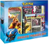 The Darkrai Premium Box focuses on the Pitch-Black Pokémon, Darkrai, and was released on May 12, 2008. The box lay the foundation for many future boxed sets in that the featured Pokémon was depicted on both a regular sized promotional card and Jumbo card. The card is part of the DP Black Star Promotional card collection, originating as a Japanese DP-P Promotional card available at the Japanese screening of The Rise of Darkrai. The Jumbo card is the first English Jumbo card released since Shadow Lugia in 2005. The Darkrai Premium Box also comes with one EX Crystal Guardians booster pack, one EX Dragon Frontiers booster pack, and one Theme Deck from Secret Wonders: Lavaflow or Powerhouse.