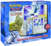 Similarly to the Darkrai Premium Box released in May 2008, the Dialga Premium Box, released on August 15, 2008, focuses on the Temporal Pokémon, Dialga, as both a regular sized and Jumbo Black Star Promotional card. The Jumbo promotional card was available as either a Mirror Holofoil or Cracked Ice Holofoil. The box also comes packaged with one Diamond & Pearl booster pack, one booster pack from either Secret Wonders or Great Encounters, and a Theme Deck from either Diamond & Pearl or Mysterious Treasures.