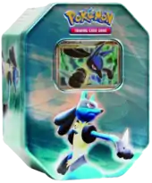 As its name suggests, the Lucario Collector's Tin focuses solely on the Aura Pokémon Lucario, and is the first Collector's Tin to have a standalone release. Available during November 2007, the tin includes a promotional reprint of the Lucario LV.X card from Mysterious Treasures and four Diamond & Pearl Series booster packs from a selection of the first three expansions. The tin was re-issued in late 2008 and repackaged with a Cosmos Holofoil Lucario from POP Series 8, this time with only three booster packs. These boosters included two from late EX Series expansions, and one from a late Diamond & Pearl Series expansion.