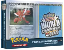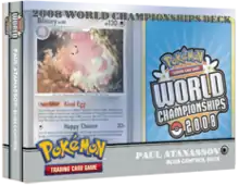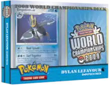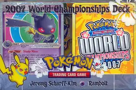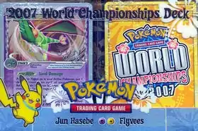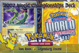 The 2007 World Championships Decks were released on November 19, 2007, following the 2007 World Championships in August. These decks include Flyvees as used by Junior Division champion Jun Hasebe, Legendary Ascent as used by Master Division champion Tom Roos, Rambolt as used by Senior Division champion Jeremy Scharff-Kim, and Swift Empoleon as used by Senior Division runner-up Akira Miyazaki. Each deck comes with a booklet about the championships, and a non tournament legal print of the sixty card deck. Each card has a 2007 World Championships back, silver border, and signature of the deck owner.