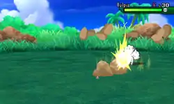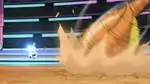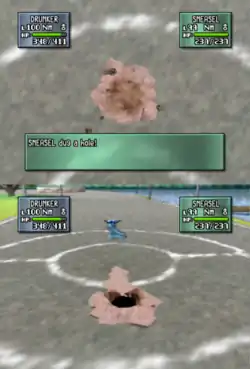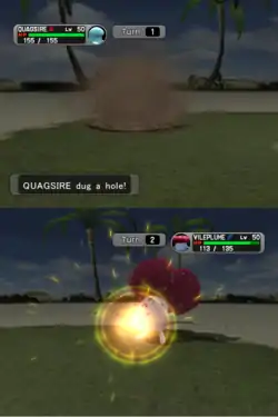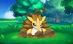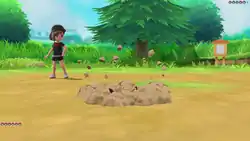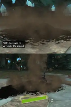 | Buizel digs a hole into the ground using both of its hands. It then travels underground and attacks the opponent from behind. As it travels underground, the dirt above it moves and leaves a trail. | |||