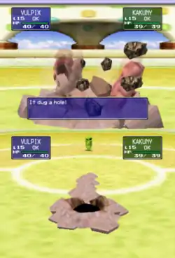 Arbok dives into the ground and digs underground. It then comes up underneath the opponent and attacks it. | ||