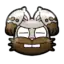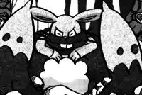 Diggersby's remaining limbs are small in comparison to the ears. The fur of the upper paws is white, while the feet are brown; each paw has three digits. A sash or belt-like band composed of thicker, woolly fur surrounds its waist; it tends to tuck its paws into this fur. This sash is divided into sections: brown on its sides and yellow on the front and back. Its short tail is also yellow and protrudes from the back section of the sash. Diggersby's face has a large brown muzzle with prominent cheeks. The coloration around its muzzle extends down onto its neck and resembles beard stubble. It has two large upper incisors, three whiskers on each cheek, a tiny, pink nose, and eyes that appear to perpetually squint.
